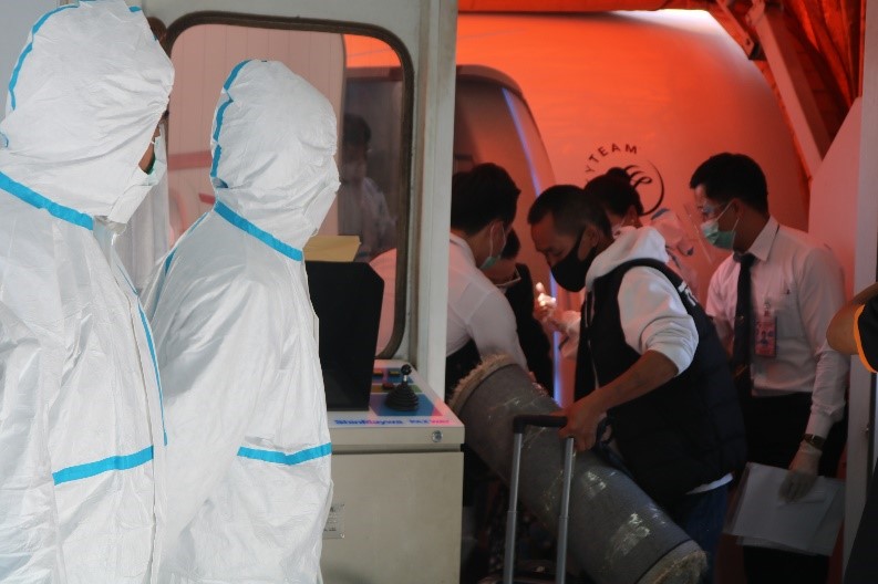 20201120-covid-19-air-travel-health-staffThe health staff checked the completeness of documents from the passengers, including COVID-19 test results taken before departure and the health declaration form.