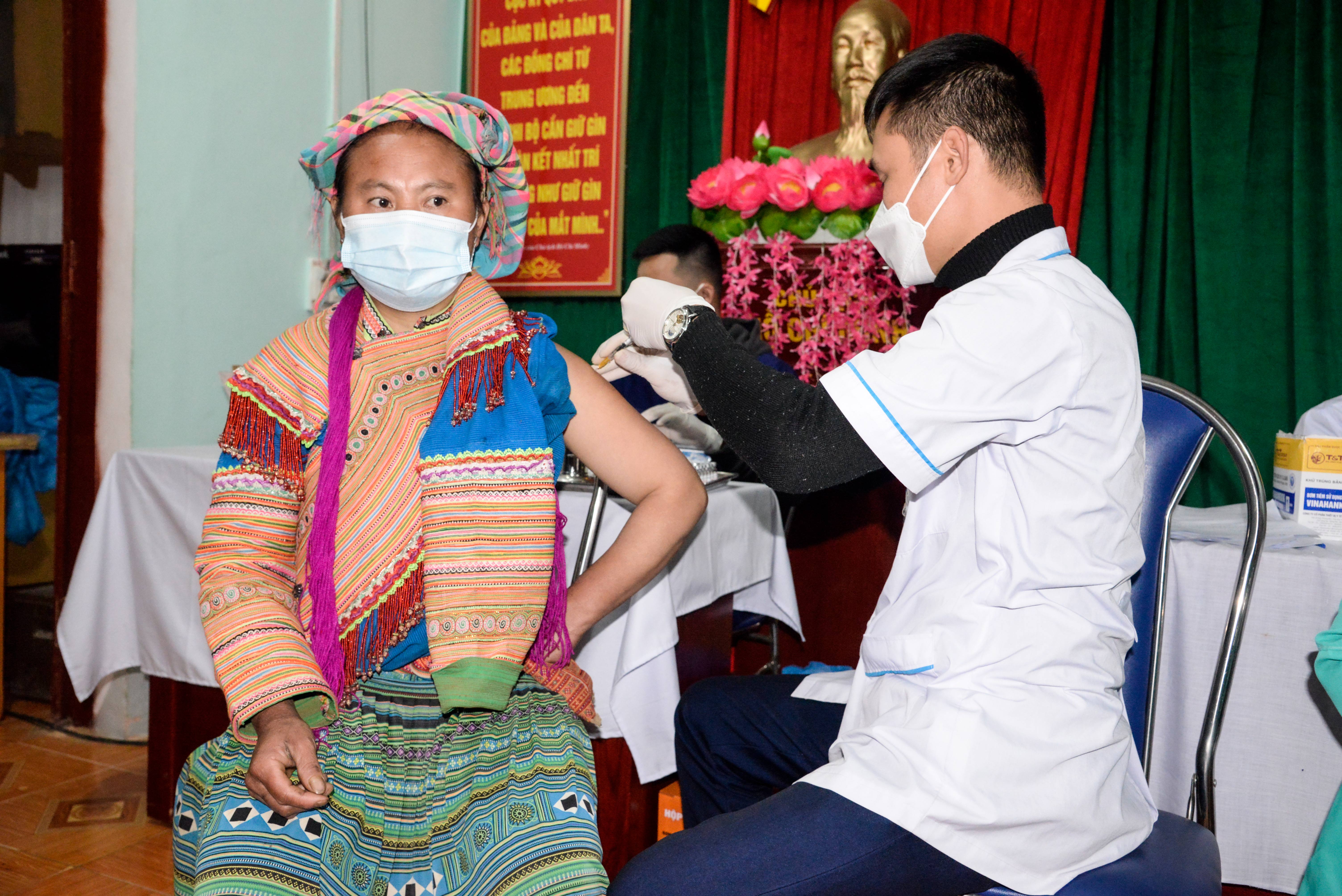 While waiting for her second dose of COVID-19 vaccine at Xin Man commune health station in Ha Giang, Mrs La worked on embroidery to sell at a monthly market along with her farm produce.